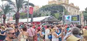 Una pantalla LED gigante acerca los detalles de la mascletà a los espectadores situados en la Avenida de la Estación