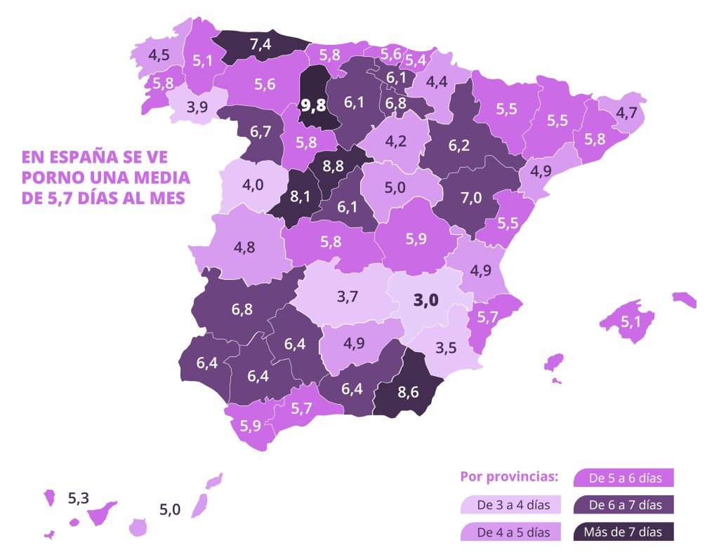 Aunque un 74,2% de los encuestados considera que hoy en día es más fácil encontrar pareja sexual, un 42,3% cree que sigue siendo difícil lograrlo. El acceso a la pornografía comienza pronto: el 57,5% vio porno por primera vez entre los 8 y los 16 años, con una media de inicio a los 15,2 años. Actualmente, los hombres consumen pornografía una media de 11,5 días al mes, mientras que las mujeres lo hacen 2,7 días. Palencia es la provincia con mayor consumo (9,8 días al mes), y Albacete la de menor (3 días).
