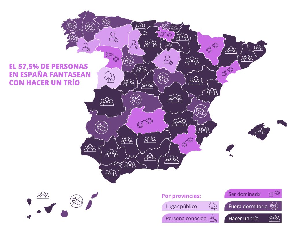 El deseo de experimentar un trío se posiciona como la fantasía sexual más común, mencionada por el 57,7% de los encuestados. Este anhelo es especialmente alto en Teruel (83,3%), Ávila (75%) y Zaragoza (67,9%). Le siguen en popularidad las relaciones en lugares distintos al dormitorio, opción líder en provincias como Lugo (64,2%), Badajoz (62,3%) y Vizcaya (60%). En Huesca (70,3%), Zamora (66,6%) y Ciudad Real (58,8%), predomina la fantasía de ser dominado sexualmente.
