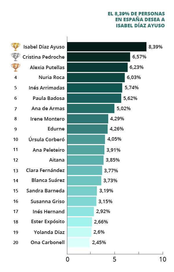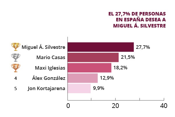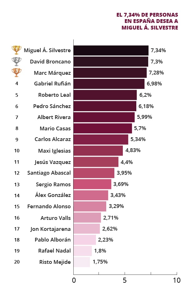 En la clasificación global, Miguel Ángel Silvestre se impone como el hombre más deseado del país (7,34%), superando por décimas a David Broncano (7,3%) y a Marc Márquez (7,28%). En la categoría femenina, Isabel Díaz Ayuso (8,39%) se proclama indiscutible ganadora, seguida de Cristina Pedroche (6,57%) y de Alexia Putellas (6,23%).