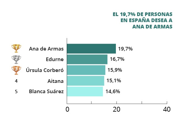En cuanto a las mujeres, Ana de Armas (19,7%) concentra apoyos principalmente en Baleares, Canarias, Madrid, Barcelona y Ciudad Real. Edurne (16,7%) destaca en Cáceres, Salamanca, Teruel, Almería y Cantabria, mientras que Úrsula Corberó (15,9%) figura como tercera opción.